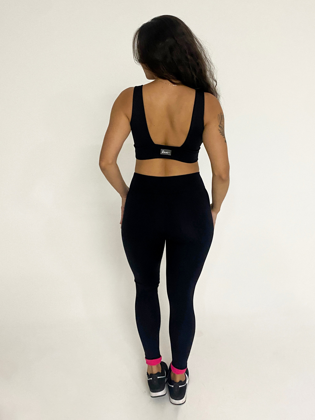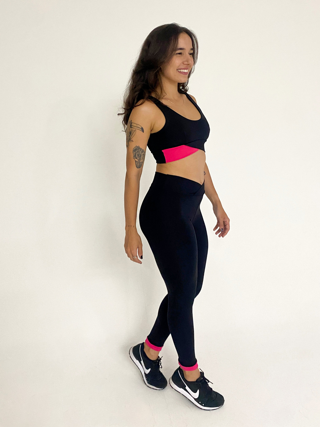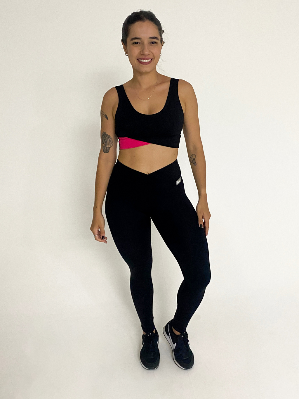 A legging REcriar, possui design versátil, apresenta um cós transpassado que desenha e modela a cintura.